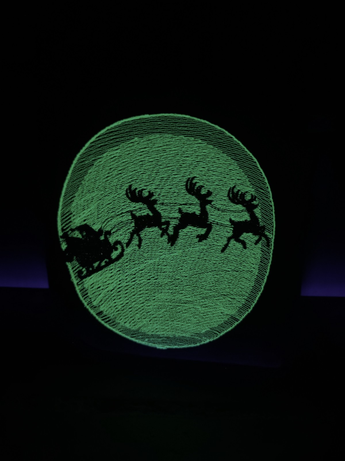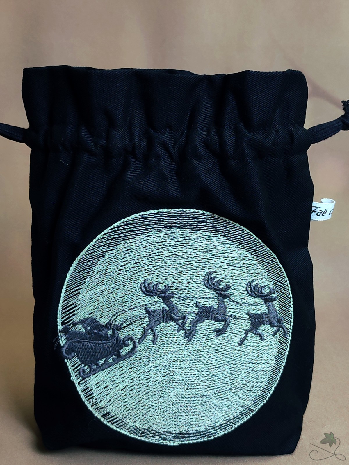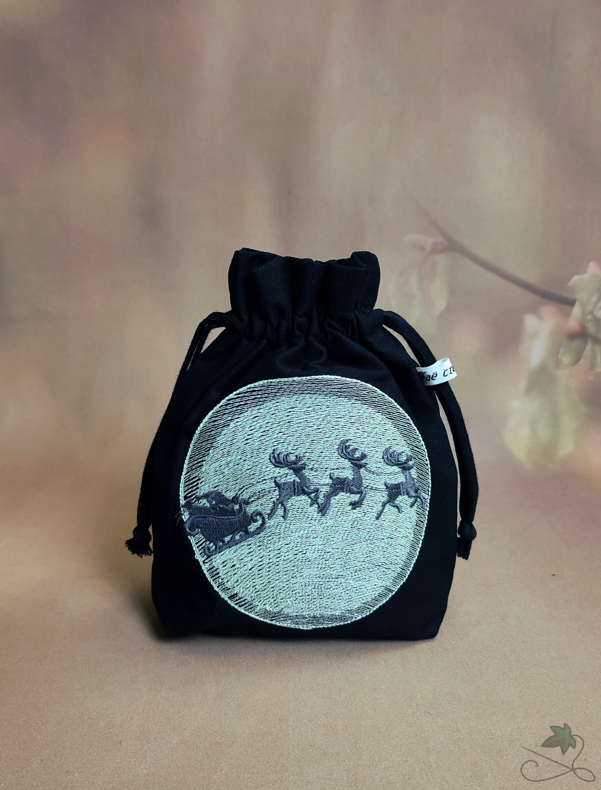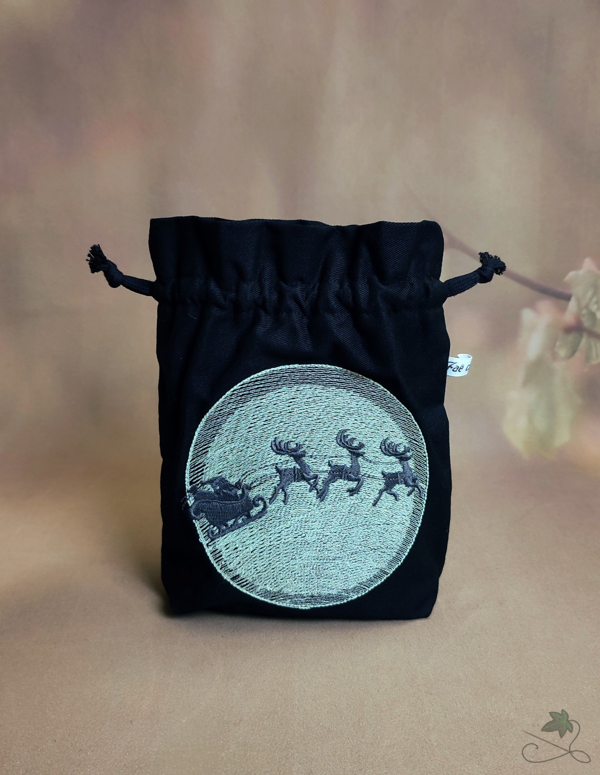 Bourse en coton noir avec broderie représentant le traineau du Père Noël s'envolant devant une pleine lune phosphorescente.