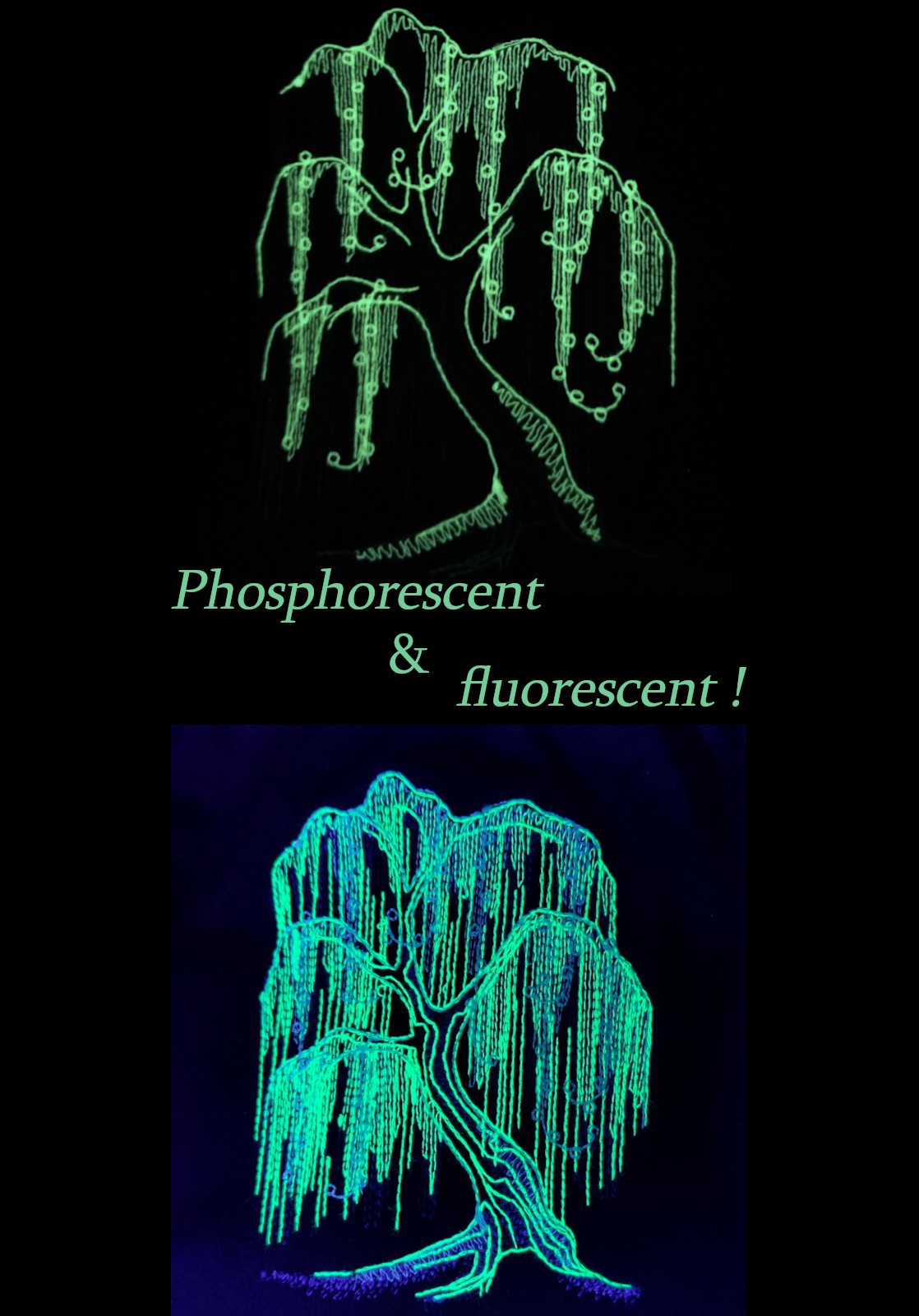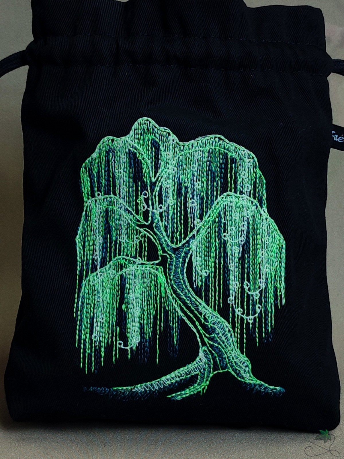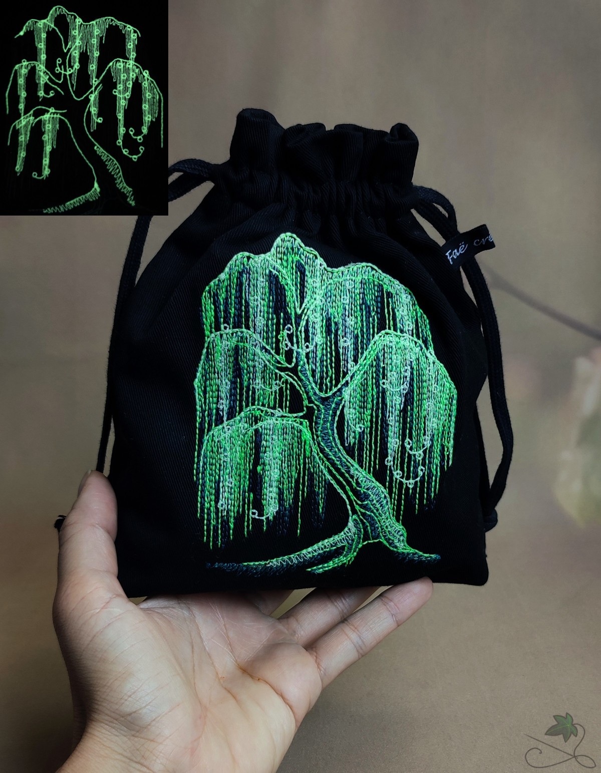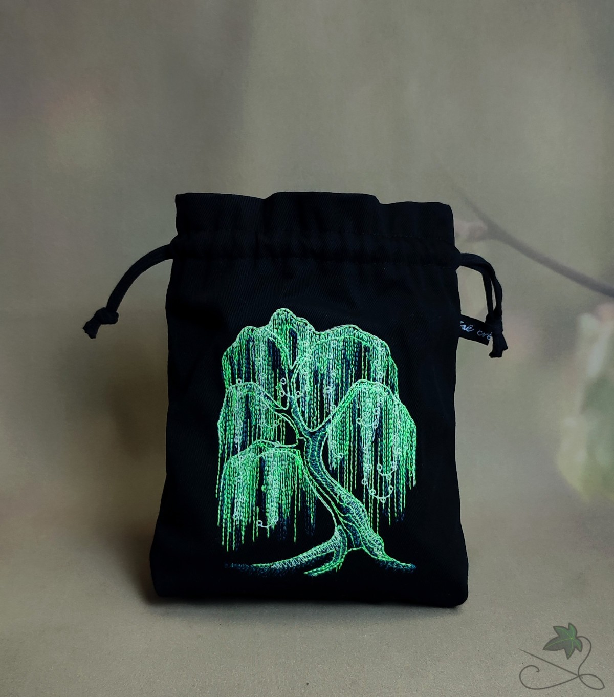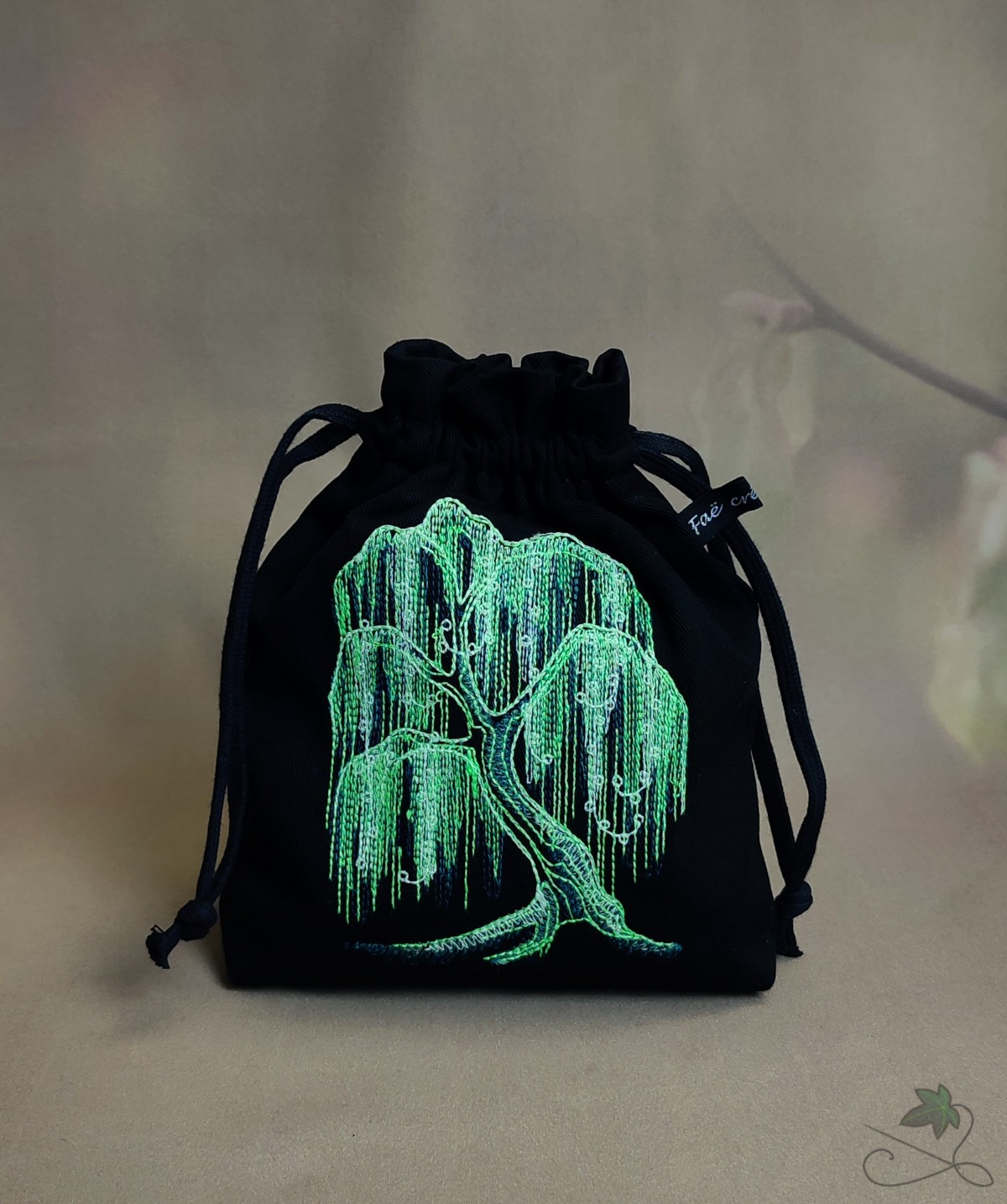Bourse en coton noir avec saule pleureur brodé, avec du fil vert fluo & phosphorescent. Si vous l'exposez à la lumière il luira un court instant dans le noir. Et si vous l'exposez à la lumière noire, le fluo révèlera toute sa luminosité ✨