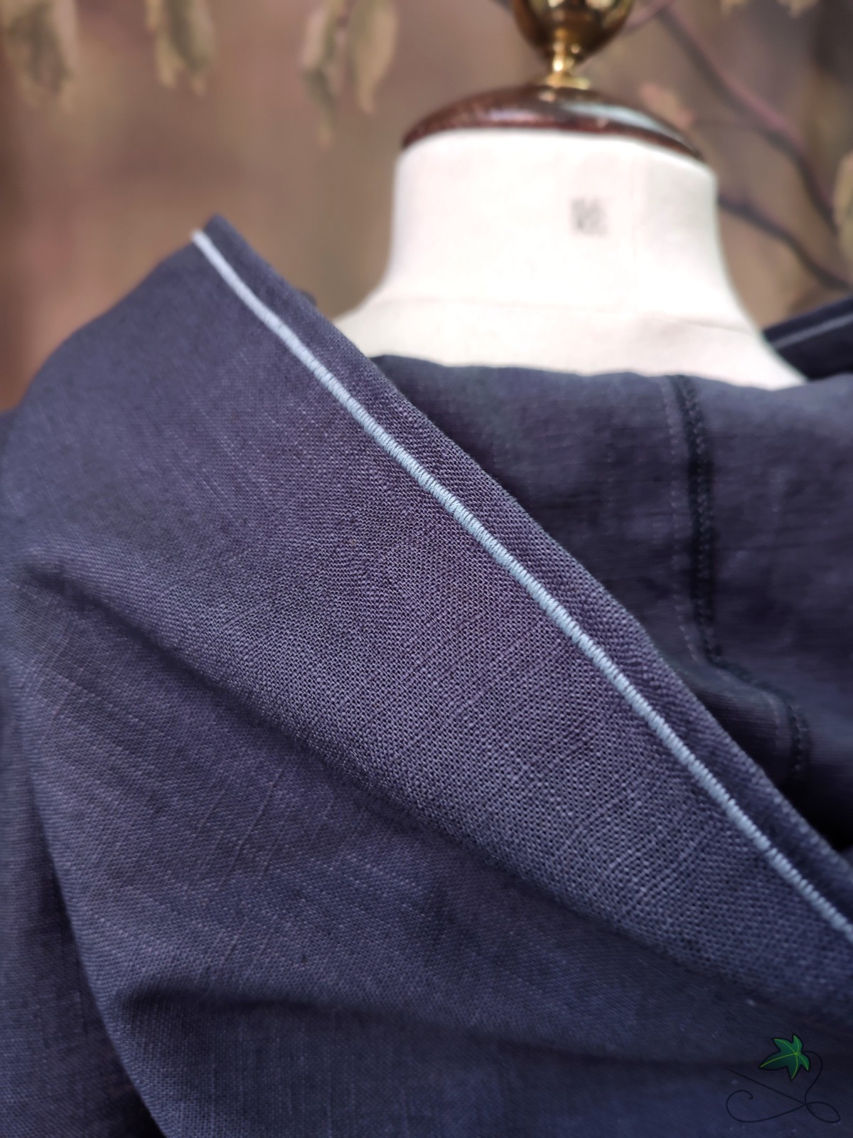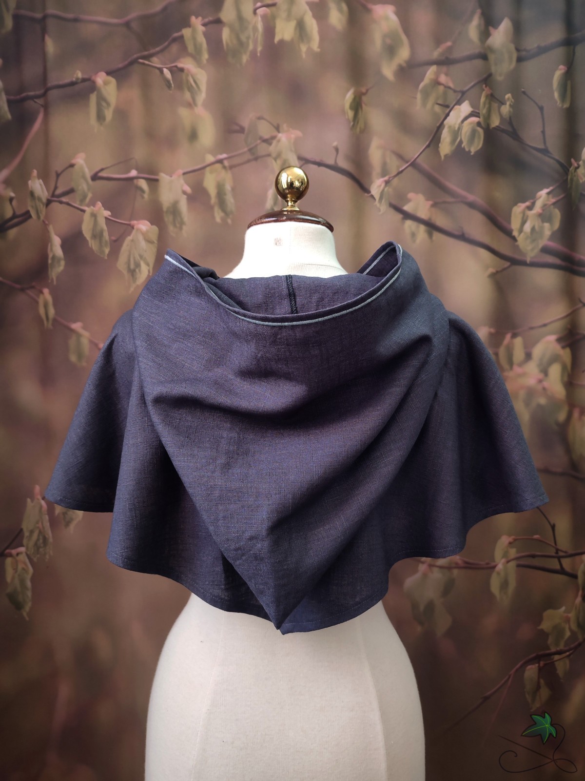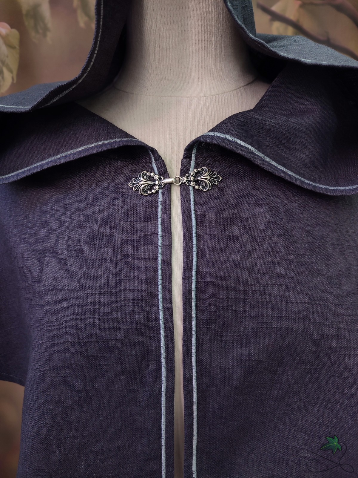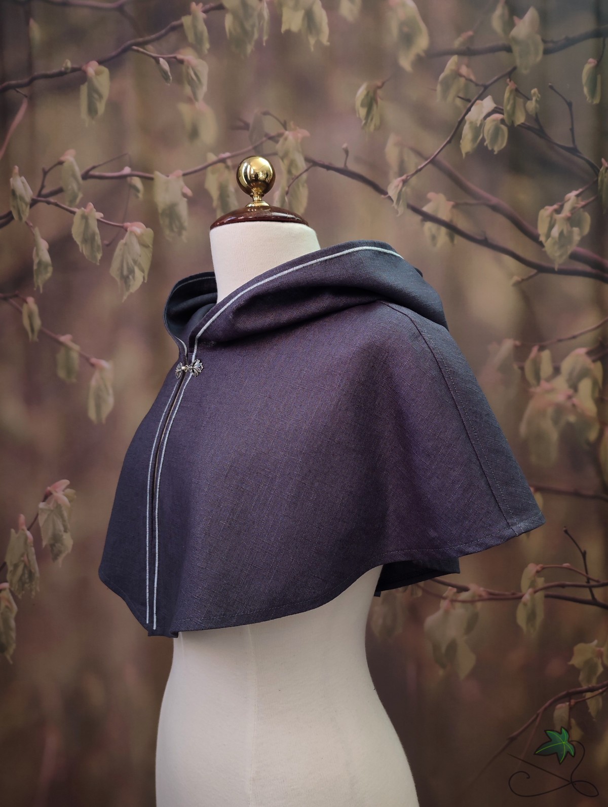 Chaperon d'inspiration médiévale en lin gris, avec capuche pointue, point de broderie gris et fermoir en métal.