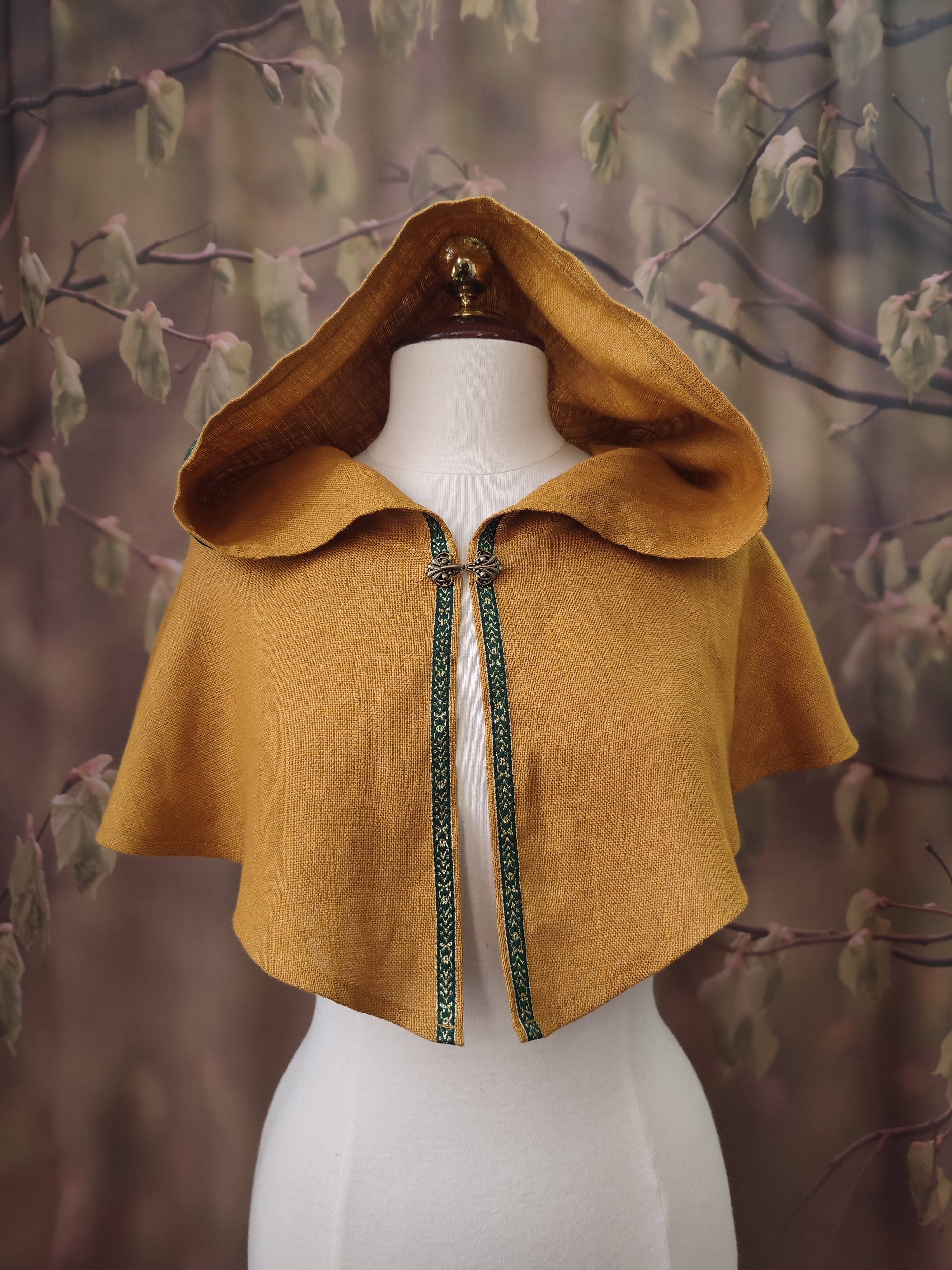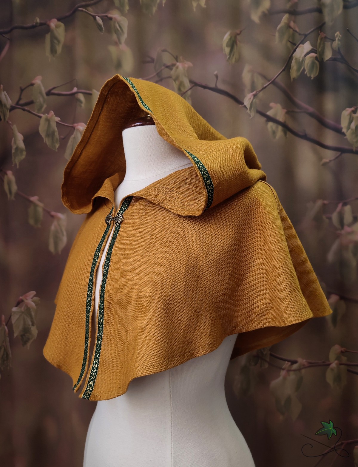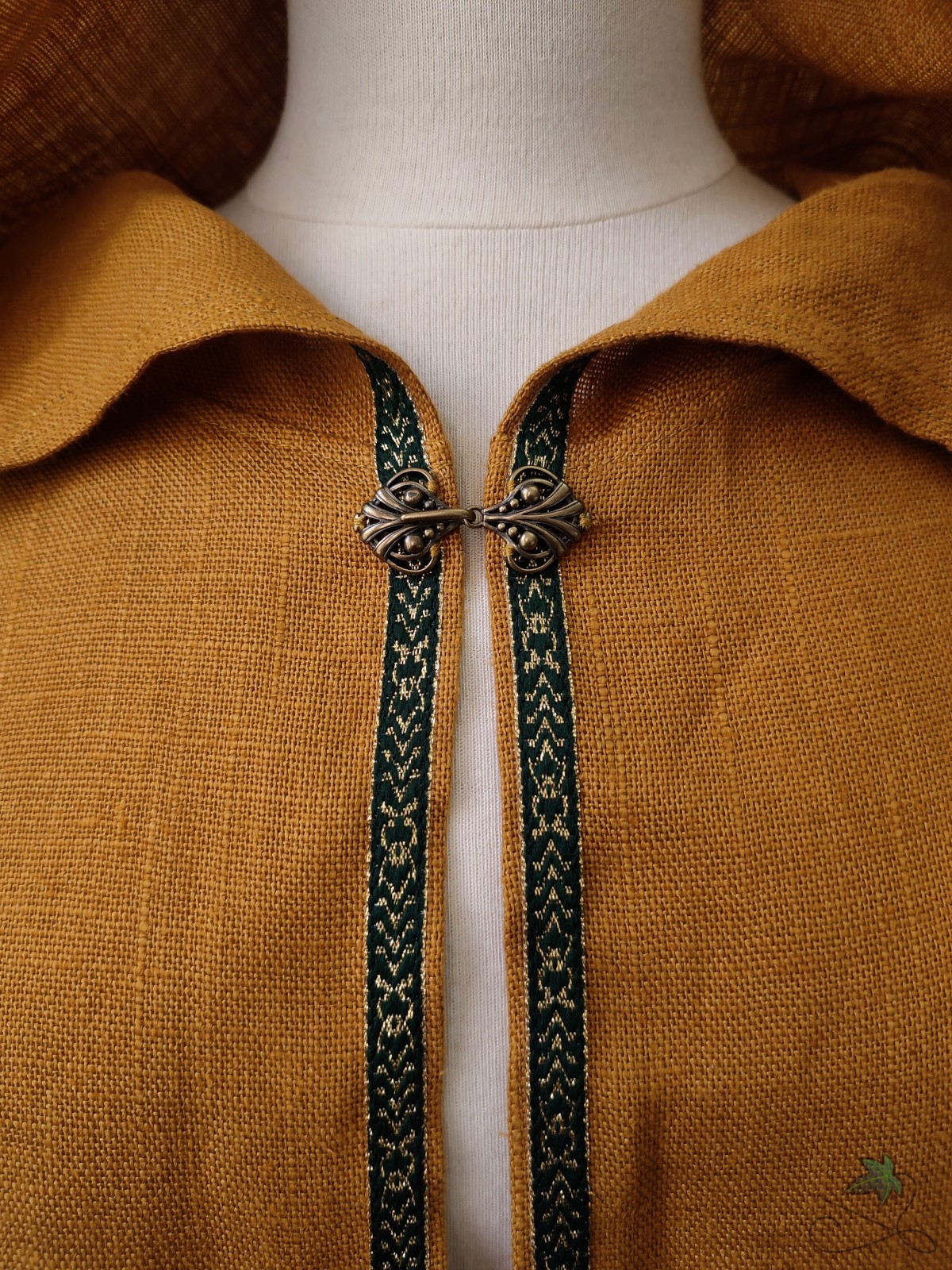 Chaperon d'inspiration médiévale en lin d'ameublement ocre, avec capuche pointue, galon décoratif vert et or et fermoir en métal.