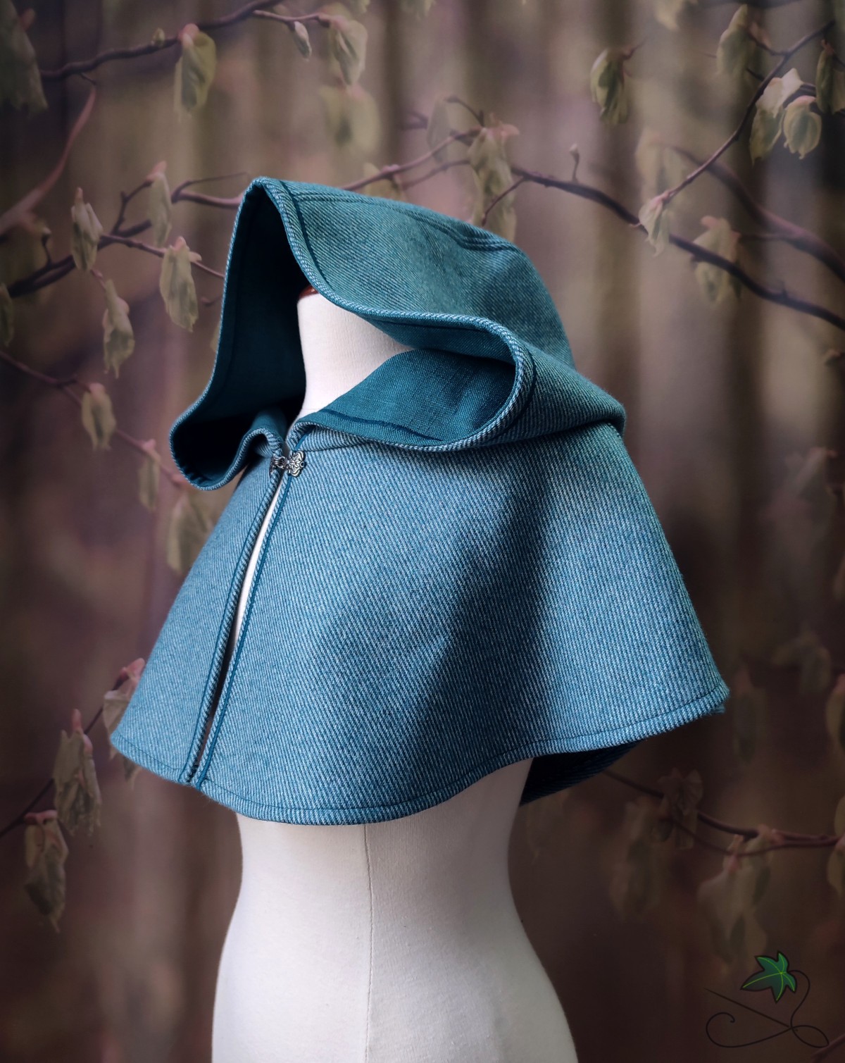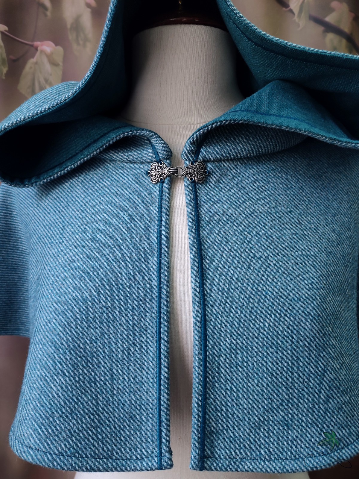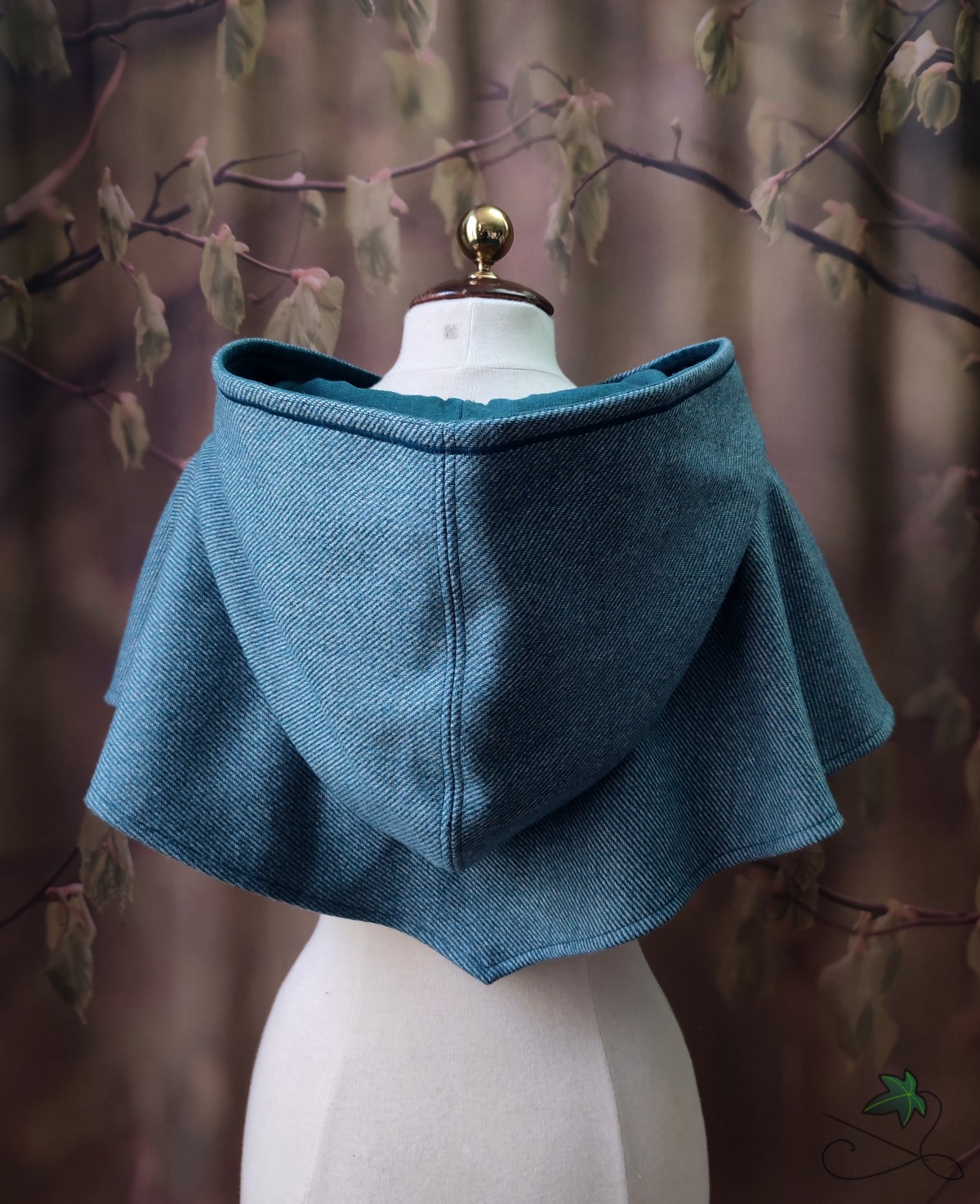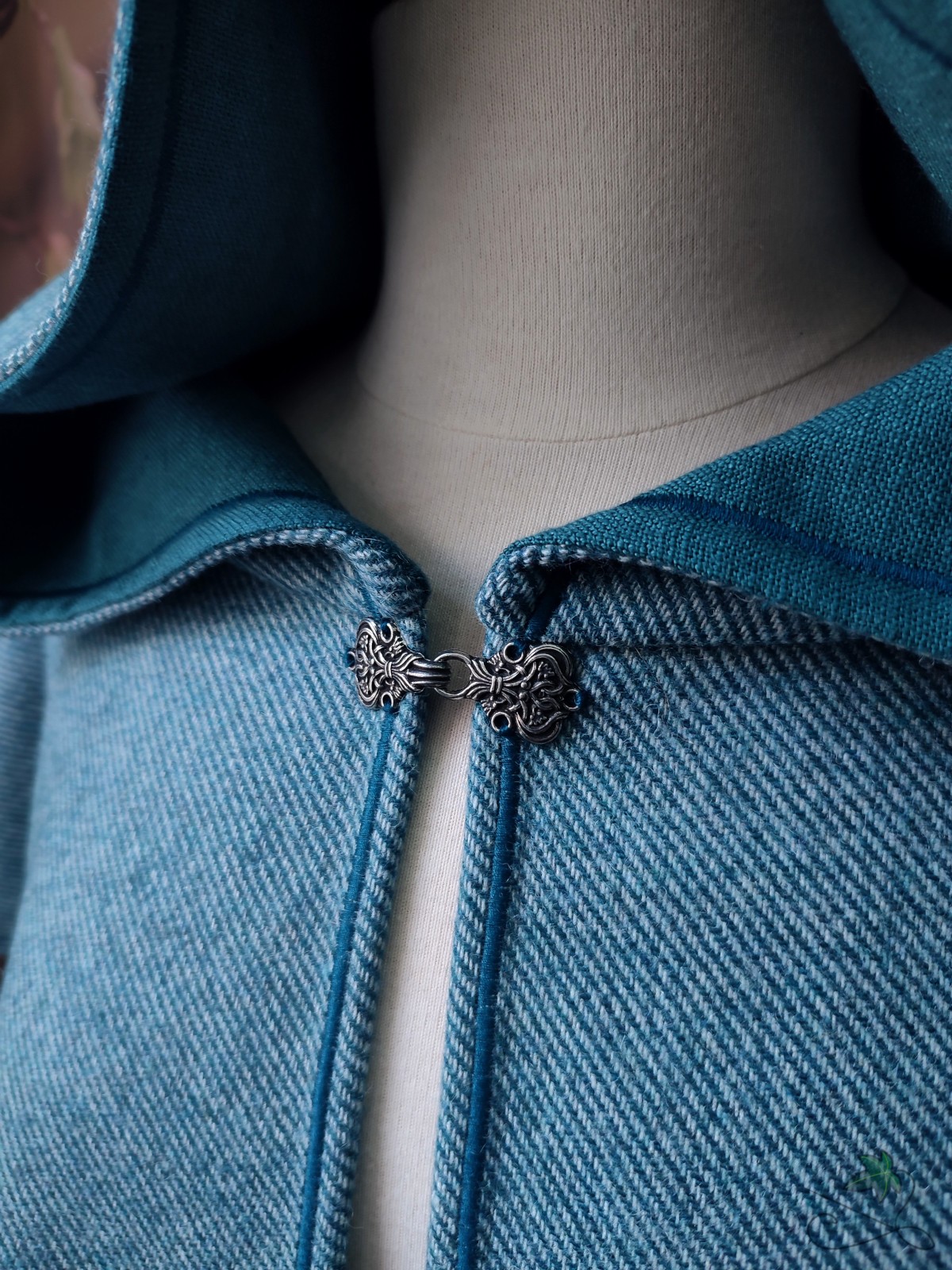 Chaperon d'inspiration médiévale en drap de laine bleu rayé, avec capuche ronde doublée et point de broderie décoratif bleu.