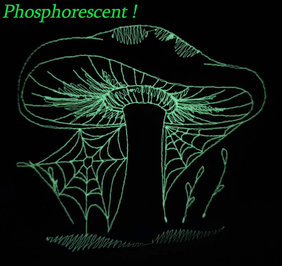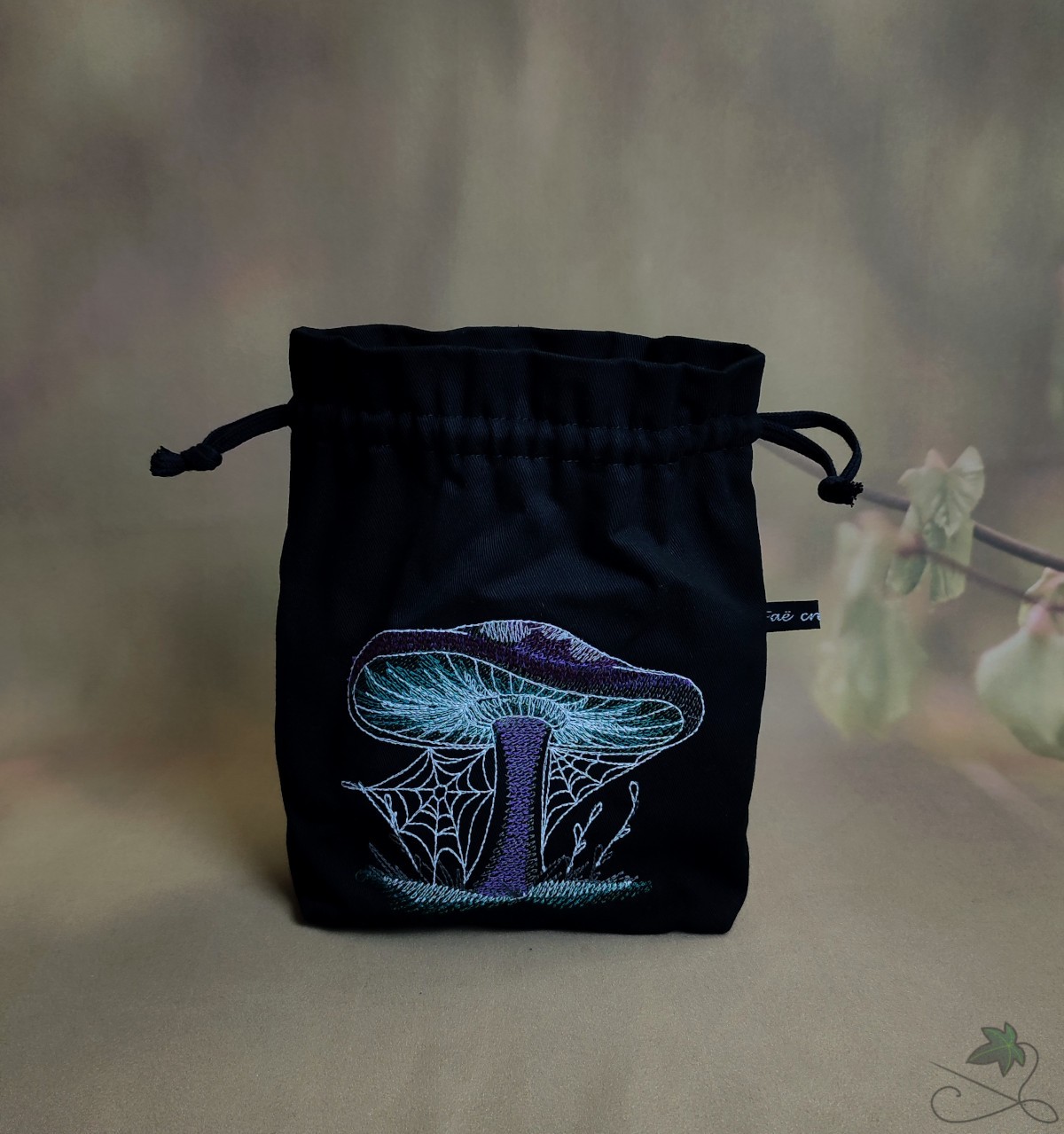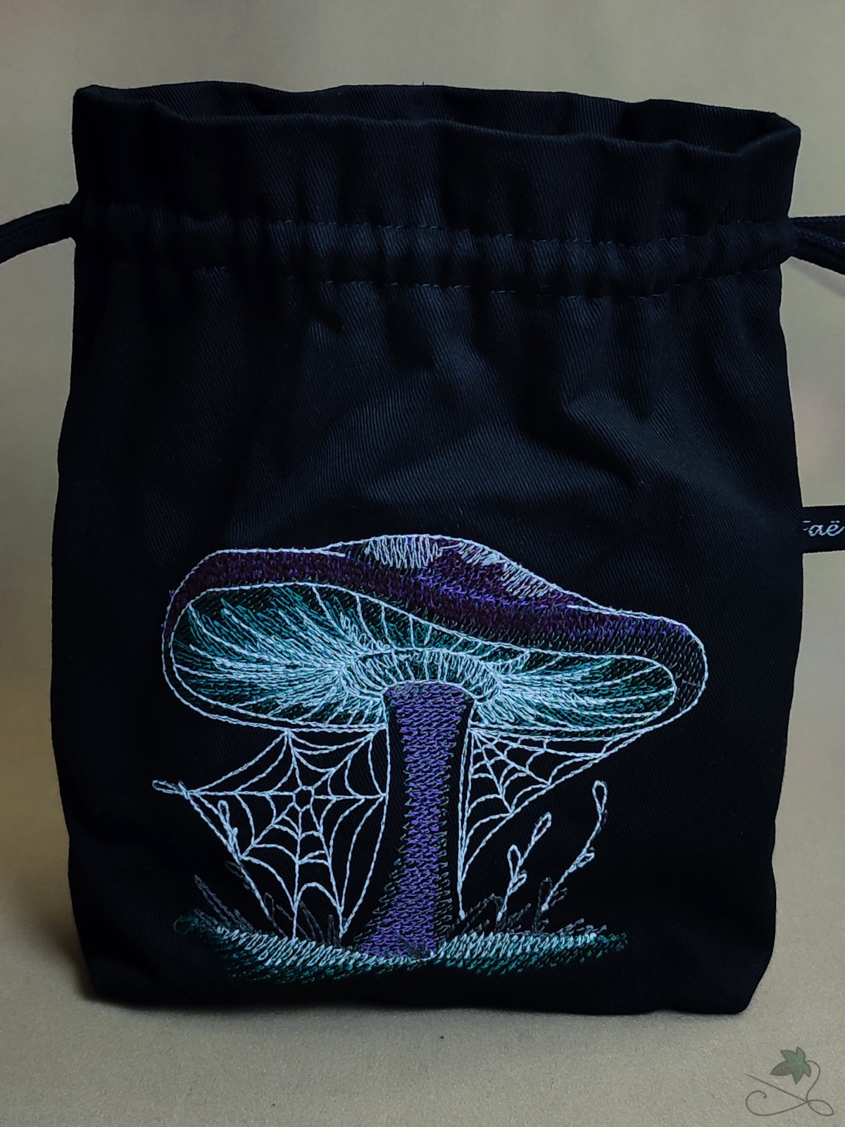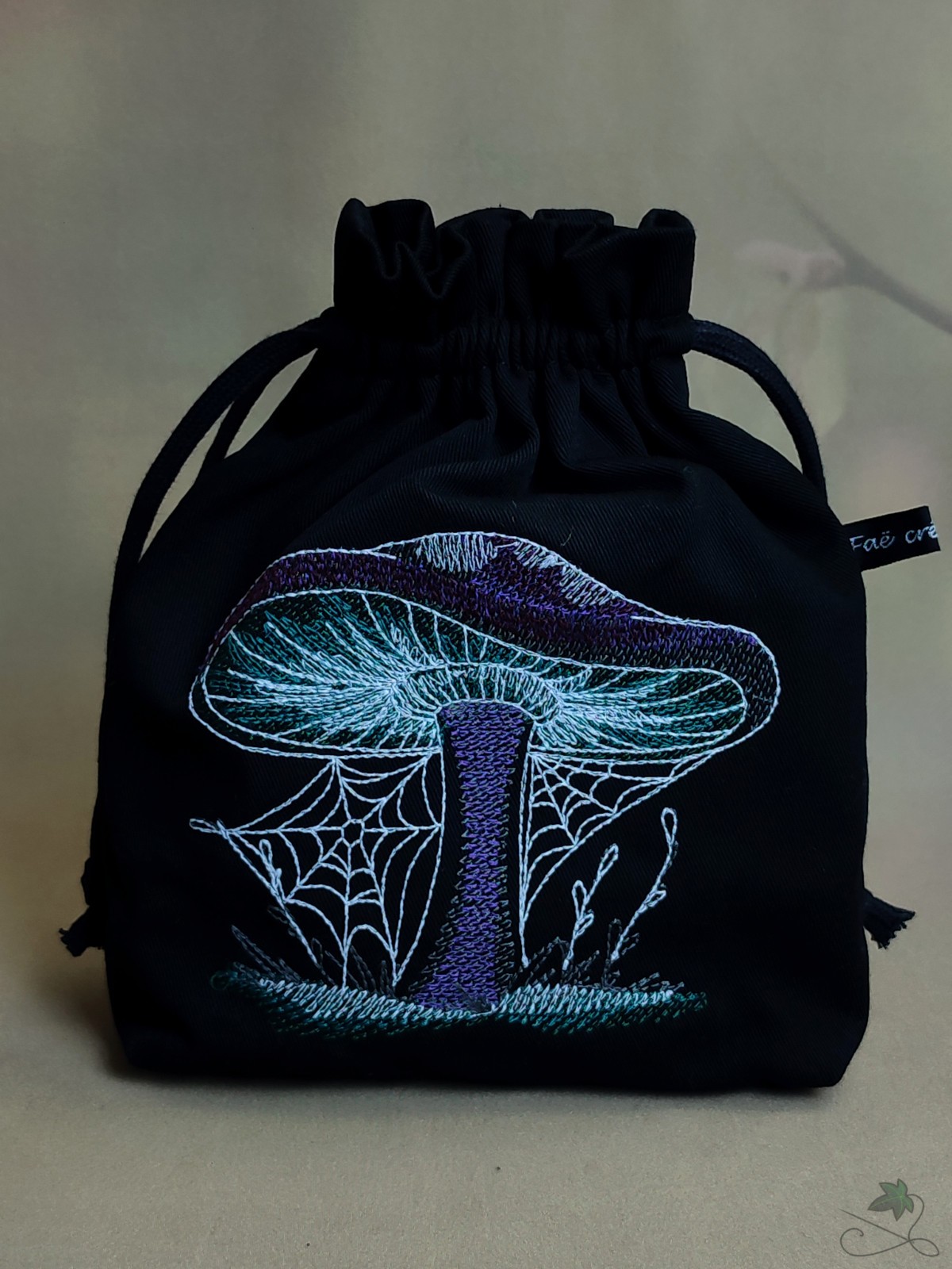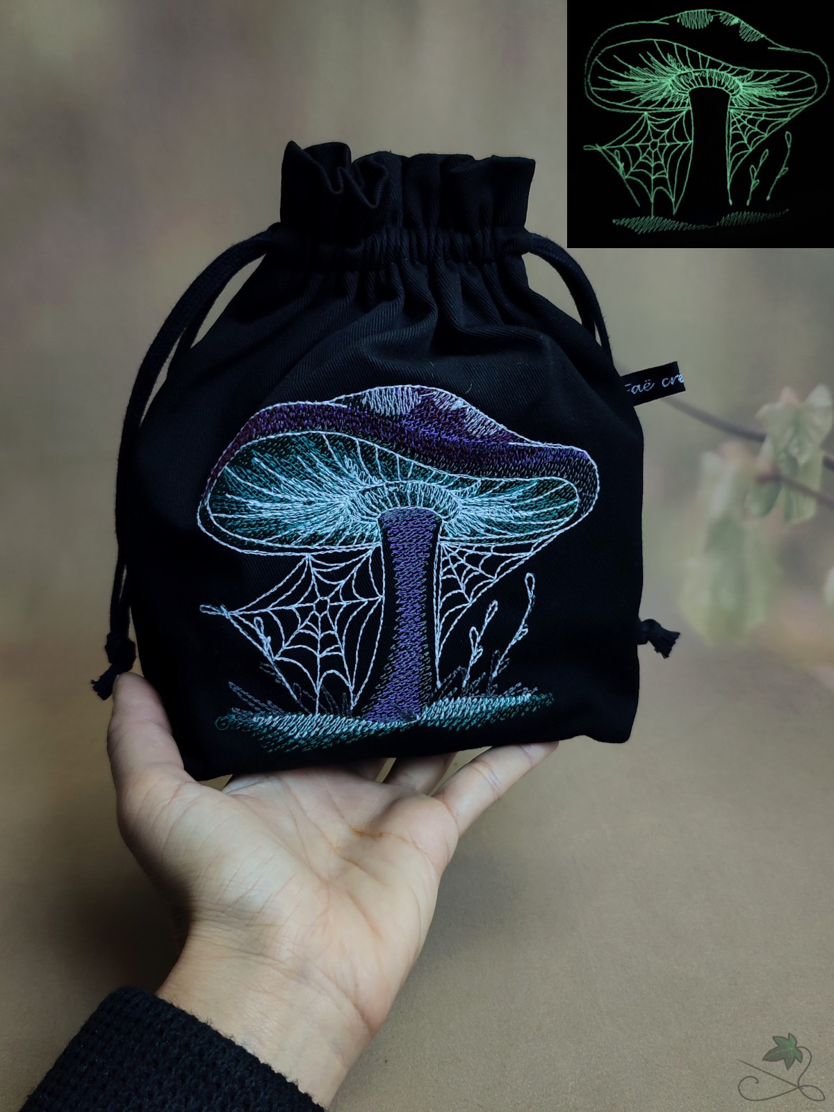 Bourse en coton sergé noir avec mystérieux champignon brodé au fil phosphorescent.