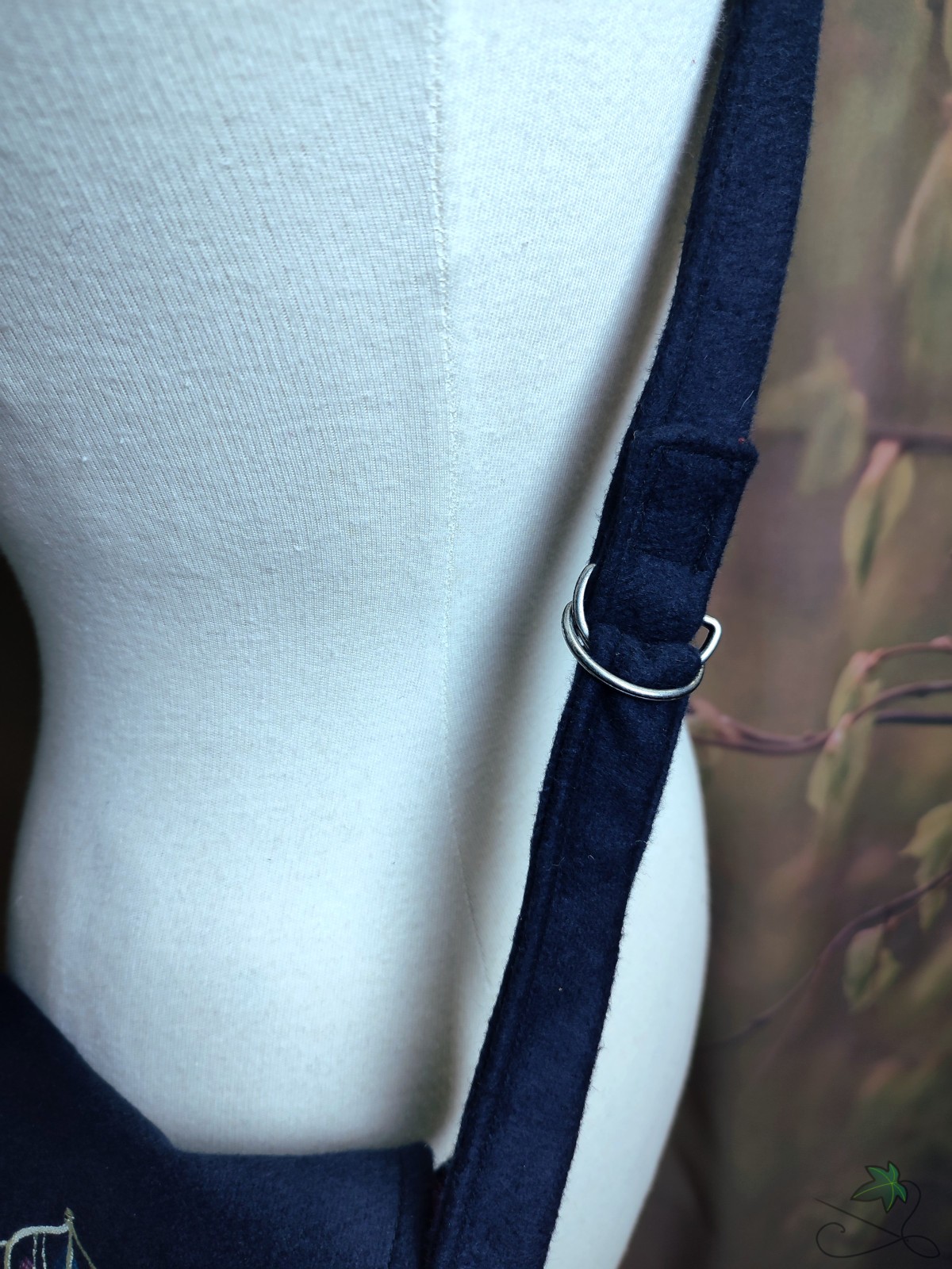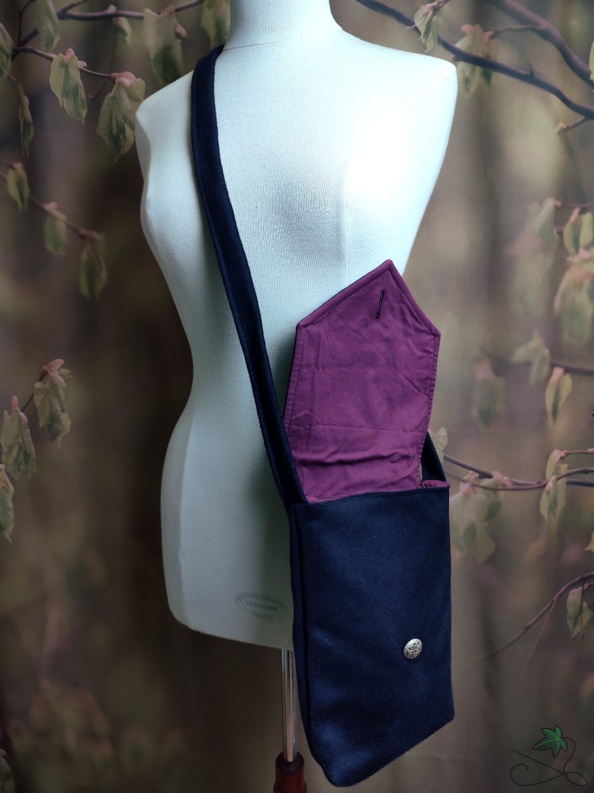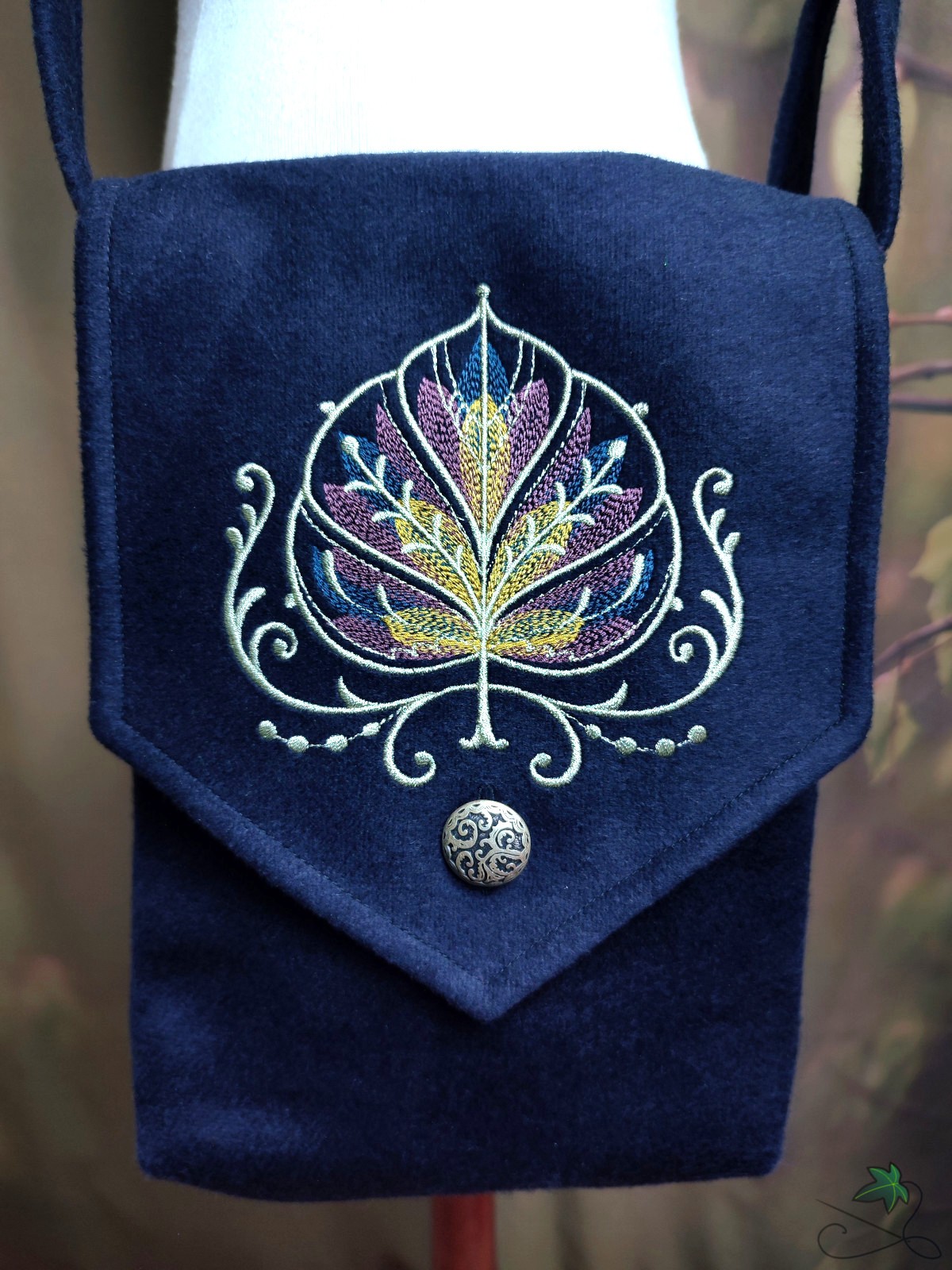 Sac en drap de laine velouté bleu sombre, avec broderie représentant une feuille de tremble ornementée. Bandoulière réglable.