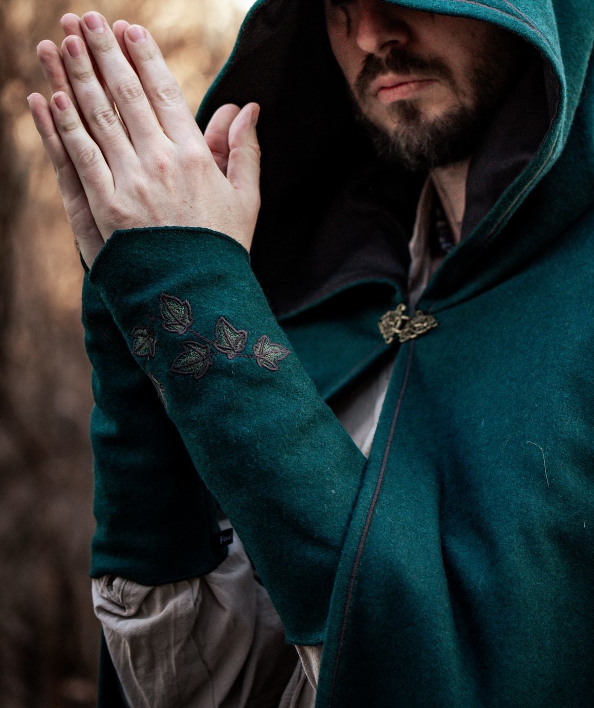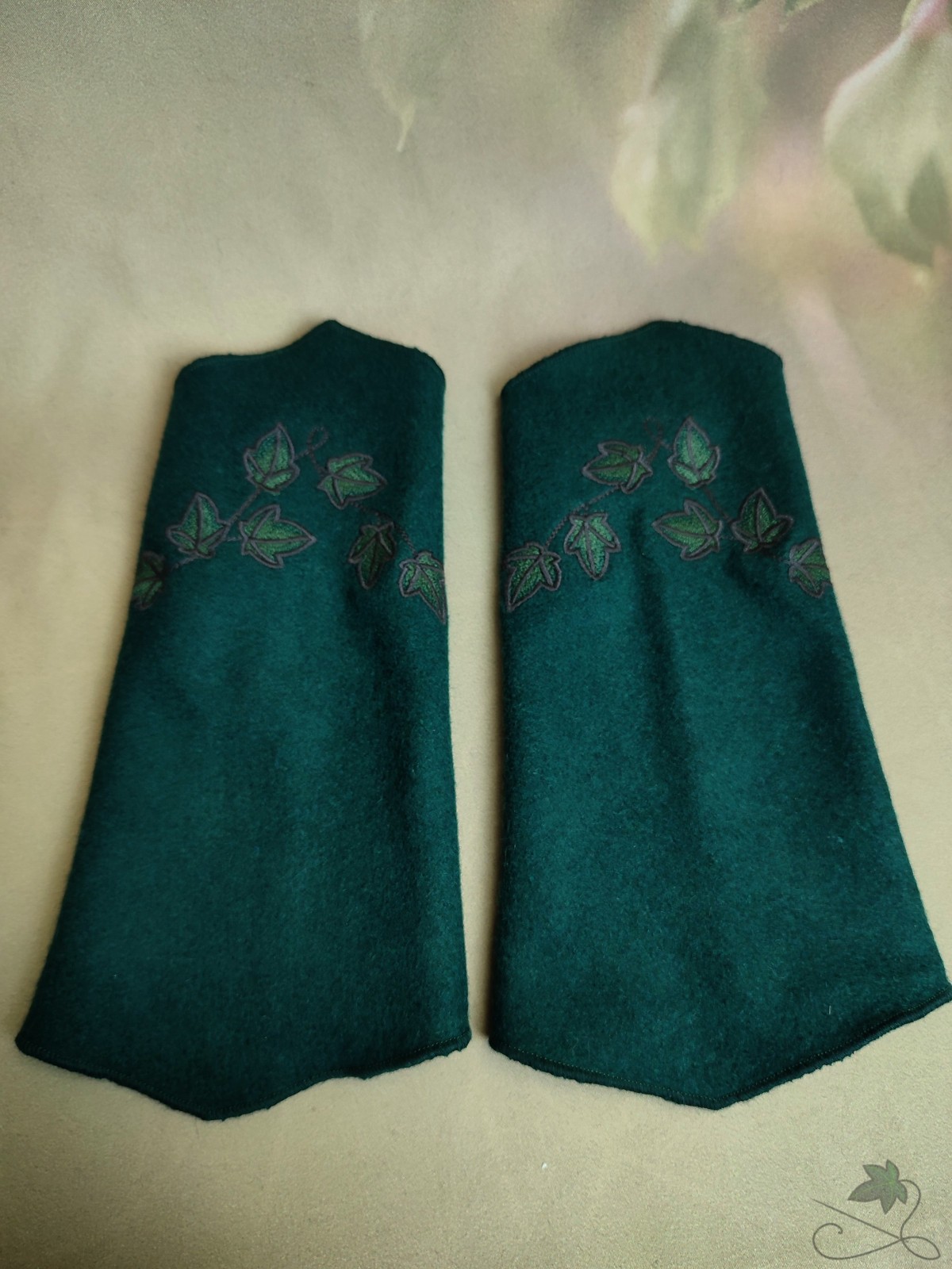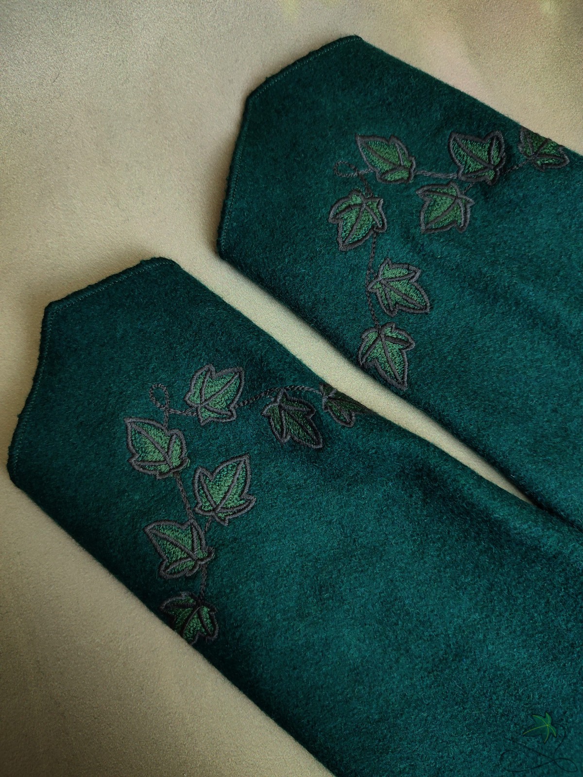Paire de manchons en drap de laine vert sapin avec lierre brodé. Légèrement extensibles.
